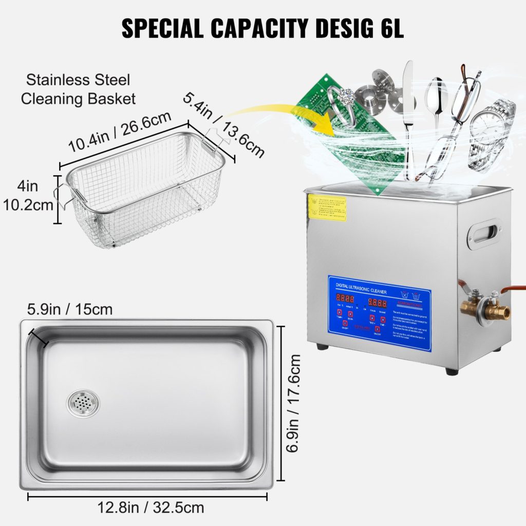 - The VEVOR Commercial Ultrasonic Cleaner boasts a substantial 6-liter capacity, providing ample space to accommodate a variety of items, from delicate watches to industrial-grade parts.